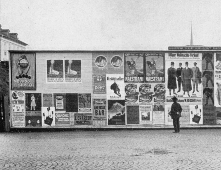 Jedes bei uns erhältliche Plakat ist eines der raren Exemplare der jeweiligen Auflage, das bis heute überlebt hat. Der bei weitem grösste Teil der Blätter ging im Aushang verloren. (Abb.: Werdmühleplatz Zürich, 1913; Quelle: Baugeschichtliches Archiv Stadt Zürich)